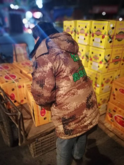 市场员工在寒冷的夜晚搬货